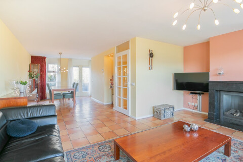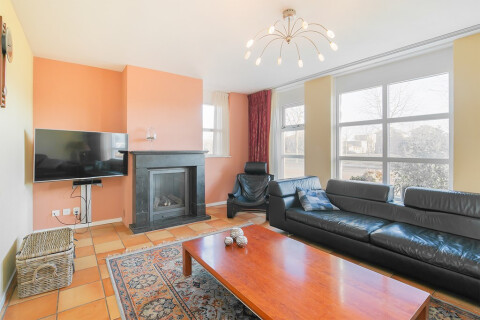 Sfeervolle living met fraaie natuursteen vloer, gashaard met natuursteen schouw, openslaande deuren naar de tuin, voorzijde met prachtig uitzicht over het water en open verbinding met de leefkeuken.