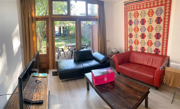 Zeer ruime en lichte woonkamer met glas-in-lood tussendeuren die het mogelijk maken de voorkamer als werkkamer te gebruiken. Via de openslaande tuindeuren toegang tot de tuin die daardoor een logisch geheel vormt met de woonkamer. Aan de achterzijde is de radiator weggewerkt in een verzonken convectorput.