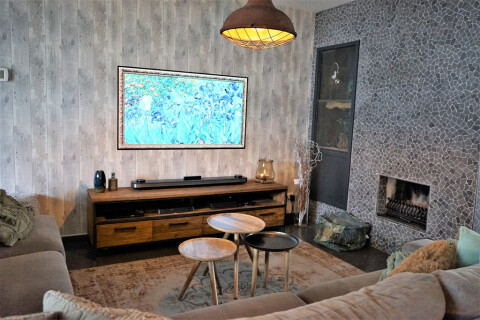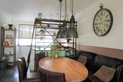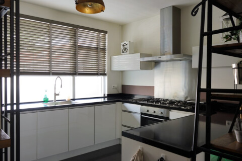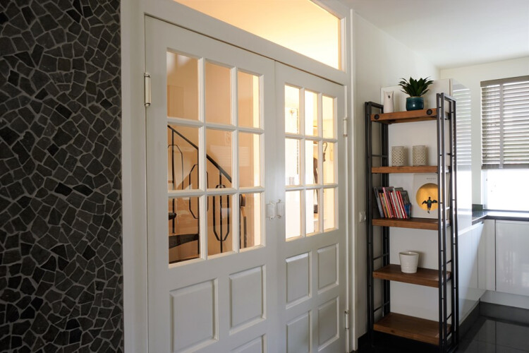 Fraaie gerenoveerde luxe royale hoekwoning met sfeervolle woonkamer met een moderne tegelvloer met vloerverwarming, openhaard, airco, shutters, elektrische gordijnen, schuifpui naar geheel bestrate achtertuin met tevens een overdekt terras welke afsluitbaar is met een glazen pui.