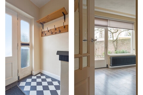 Begane grond: hal, trapkast en apart toilet, trap naar de 1e etage.