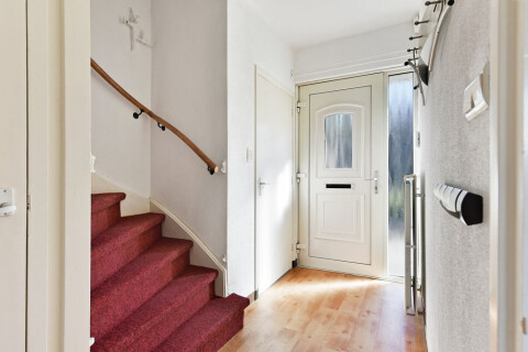 Via de met sierbestrating aangelegde voortuin bereikt men de voordeur met afdakje. Vanuit de voordeur komt men in de hal, welke is voorzien van een PVC laminaatvloer, trapopgang naar 1e verdieping, toiletruimte met wandcloset, fonteintje en bovenlicht, alsmede kelderkast met elektriciteitsmeter.