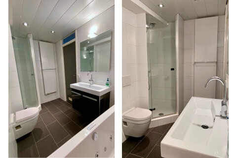 De volledig betegelde en moderne badkamer is uitgerust met een ligbad met jetstream en een thermostaatkraan, douchecabine met een thermostaatkraan, wandcloset, wastafelmeubel en een designradiator. Het geheel is uitgevoerd met antraciet vloertegels, lichte wandbetegeling en inbouwspots. De badkamer is in 2010 vernieuwd.