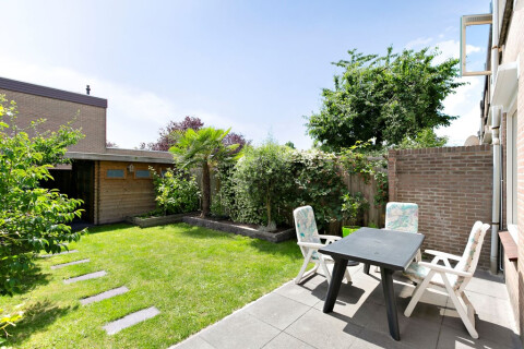 De fijne achtertuin, gelegen op het zuiden, is verzorg aangelegd met een verhard terras, gazon en diverse plantenborders met groene volwassen beplanting. Achterin de tuin staat een houten berging voorzien van elektra, met ernaast een overkapping met de eigen achterom.