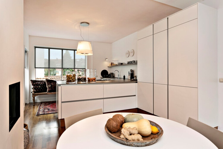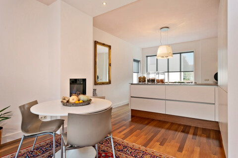 Prachtige zeer luxe uitgevoerde open woon-eetkeuken met 4-pits gasstel van Boretti, twee combi ovens (eveneens Boretti), vaatwasser, twee koelkasten, vriezer met lades en design afzuigkap, tevens uitgevoerd met gashaard en inbouwspots, toegang tot klein balkon.